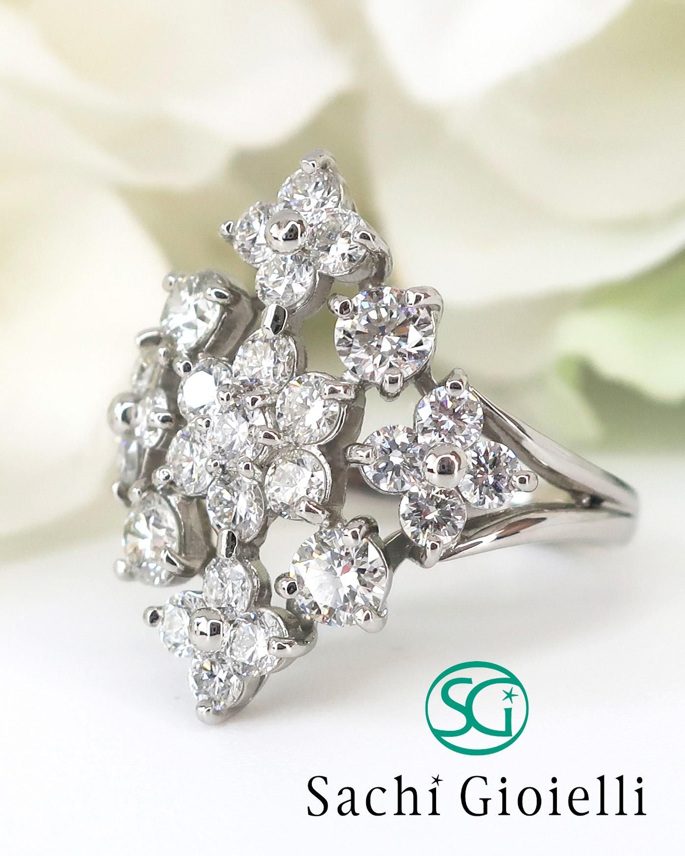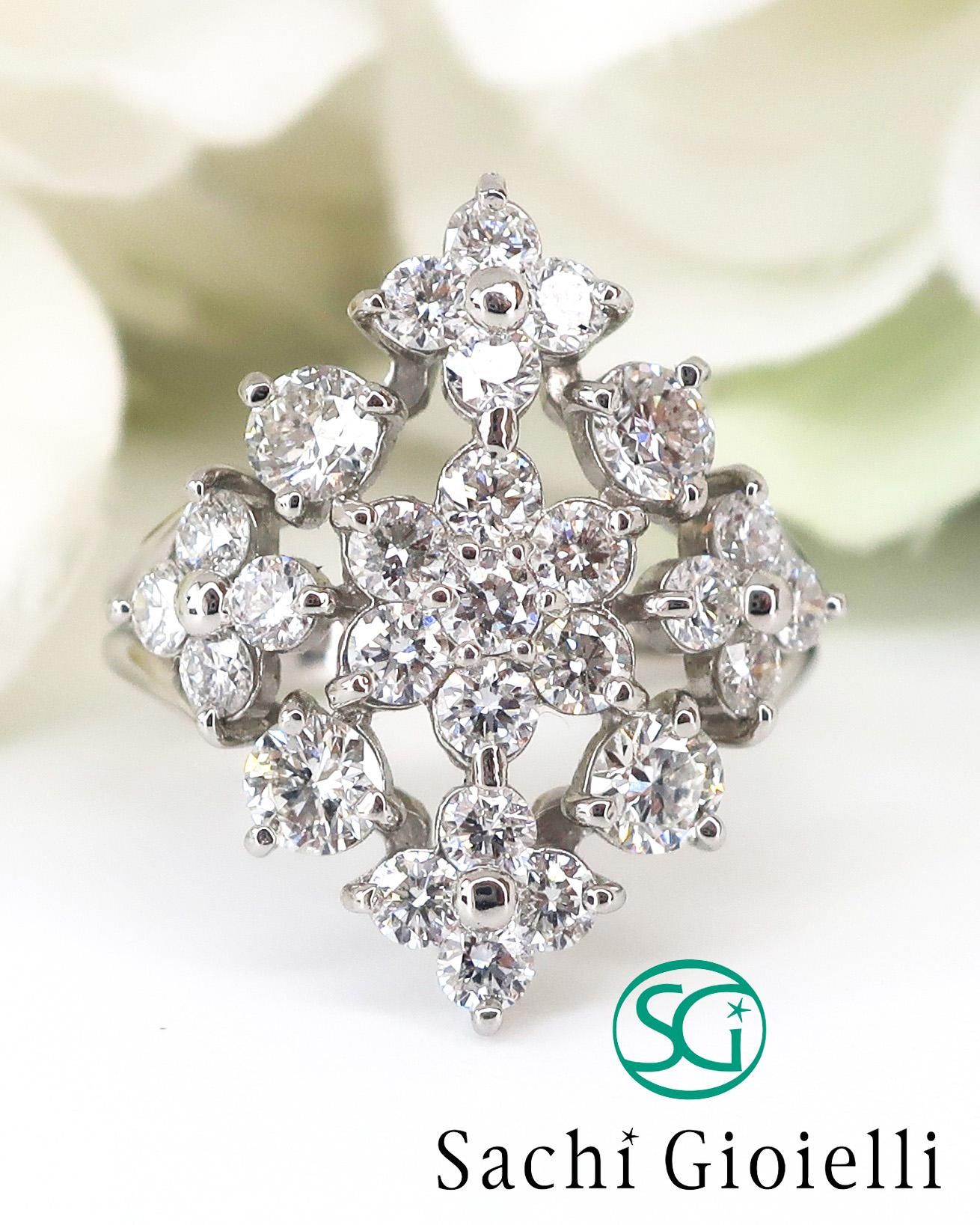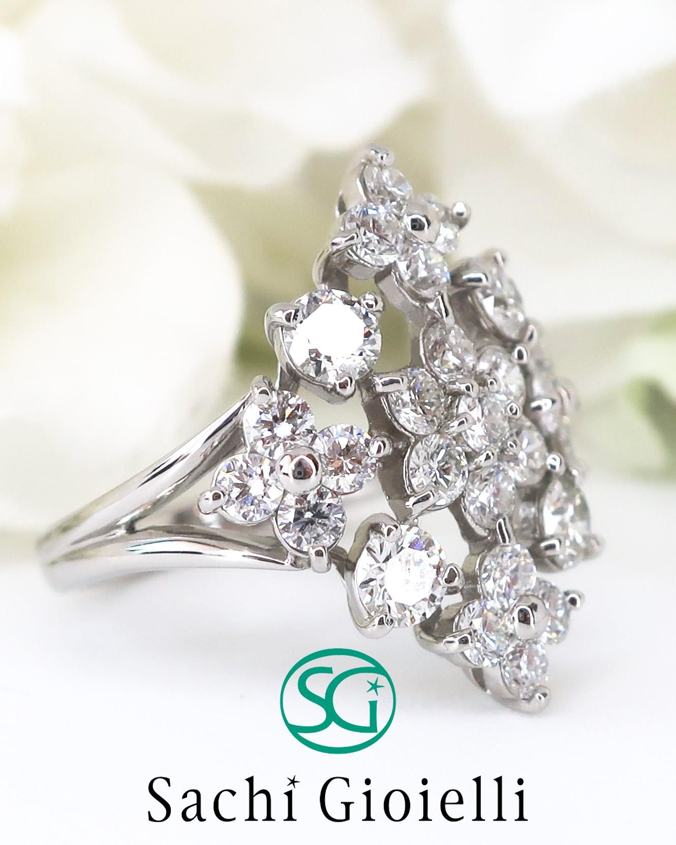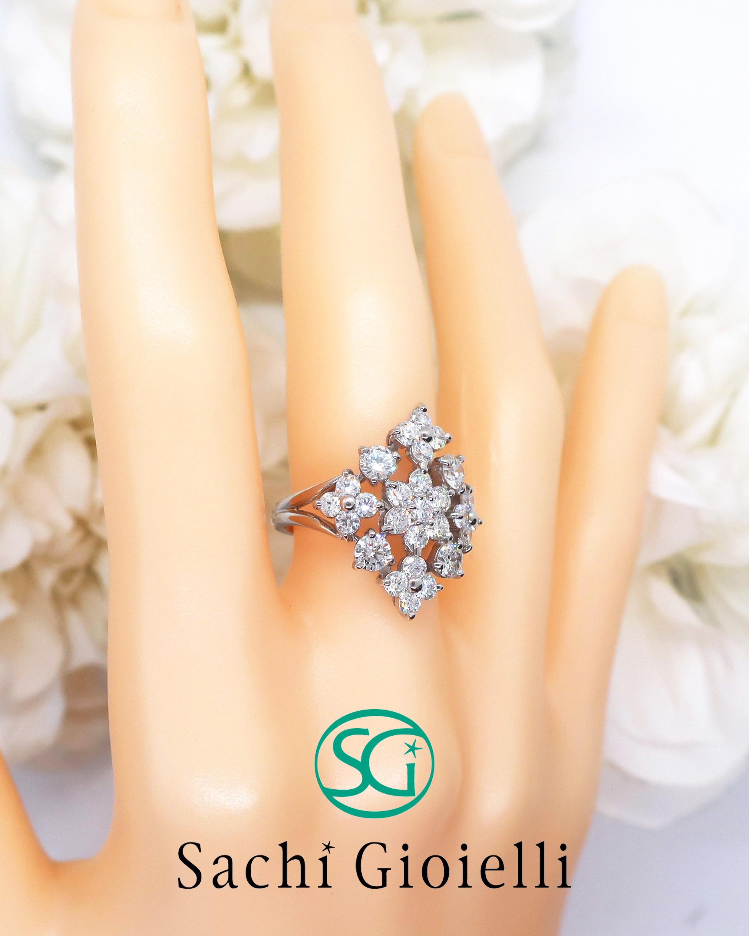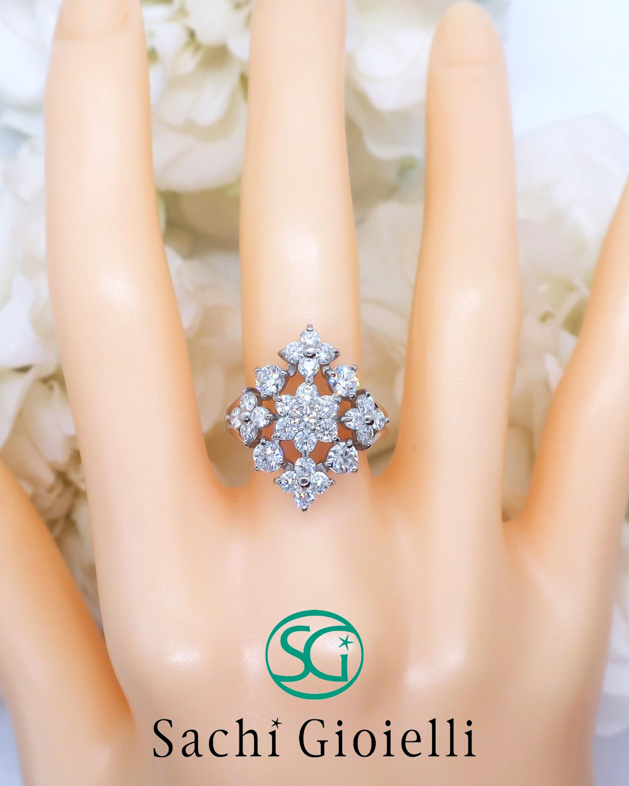 大小様々なダイヤモンドを贅沢にあしらい、合計2.00カラットの輝きが咲き誇るボリュームたっぷりのリングです。センターにはお花をモチーフにしたメインのデザインを置き、その周りには4ピースのメレダイヤで作った小さなお花が四隅に配置されています。そのお花とお花の間には一回り大きいめのダイヤモンドを4ピースセッティングし、全体をひし形にシルエットに仕上げた立体感のあるデザインです。ひとつひとつのダイヤモンドが放つ輝きが重なり合い、手元を動かすたに華やかで優美な煌めきを放ちます。中央から外側へと広がるフォルムが指先をエレガントに彩り、存在感がありながらも透かしの効いたデザインが指元に軽やかさを添えてくれます。商品には販売証明書を無料でおつけ致します。