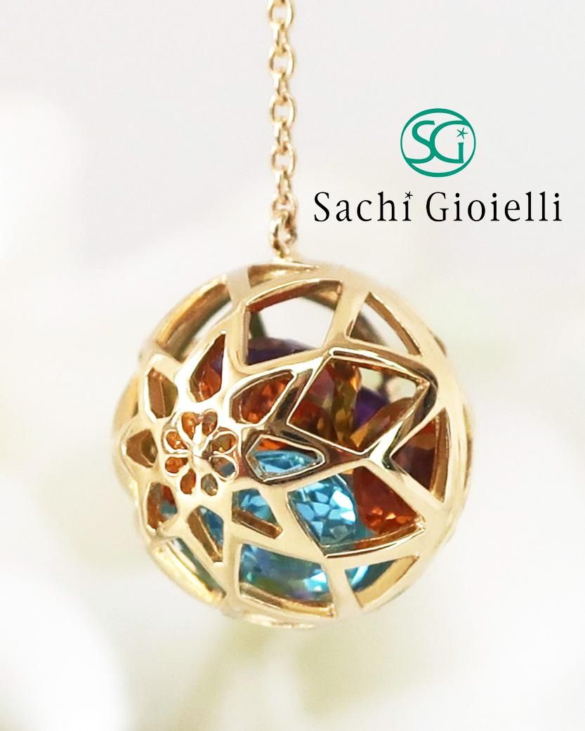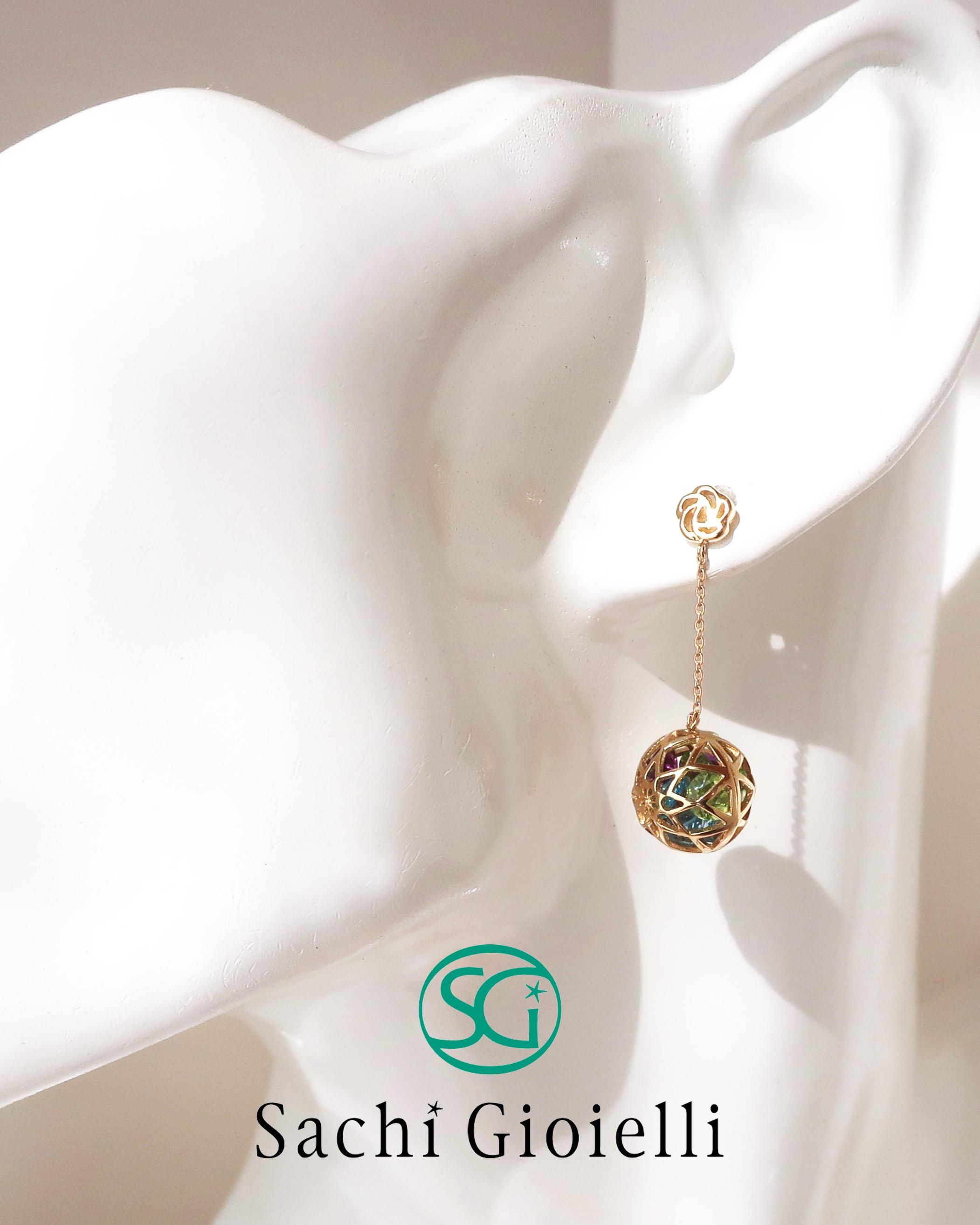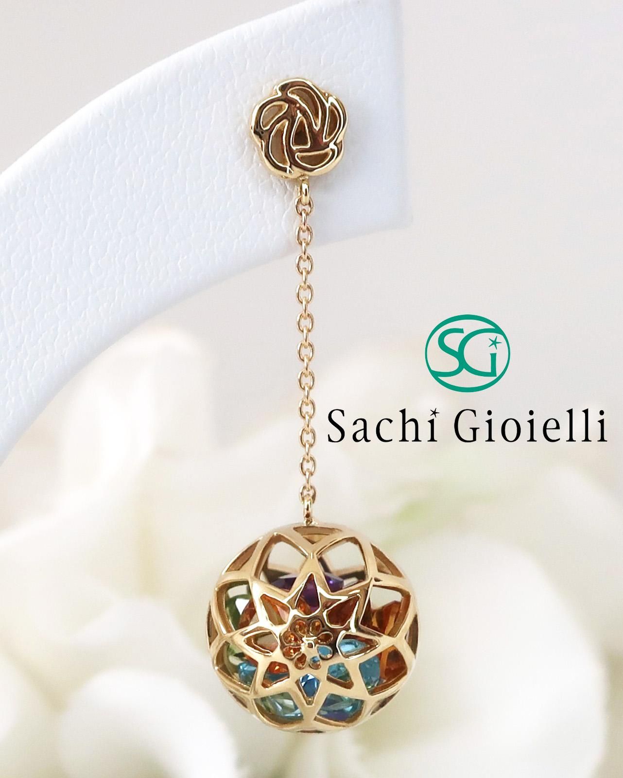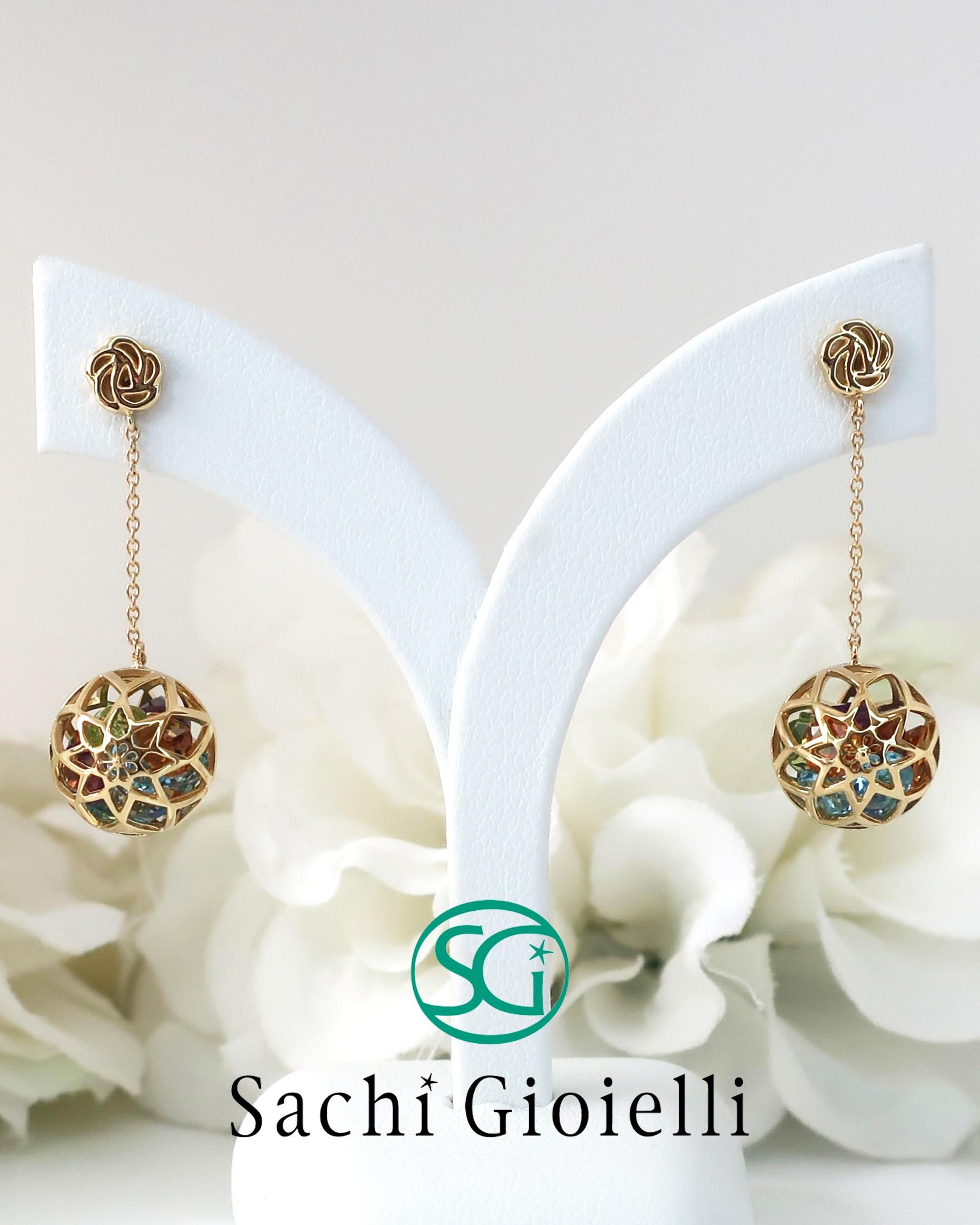 まるで手毬のように繊細な透かし模様が施された球体が耳元で軽やかに揺れるピアスです。球体の中には、アメシスト、シトリン、ペリドット、ブルートパーズといった色とりどりの半貴石がルースのまま忍ばされて、光を受けて万華鏡のようにキラキラと輝く姿は煌びやかな華やかさの中に、どこか和の趣を感じさせます。耳元の水引きのような地金のデザインから33ミリとほど良い長さで、動きに合わせて揺れるたびに、宝石達が自由に踊るように煌めく斬新なデザインのピアスです。商品には販売証明書を無料でおつけ致します。