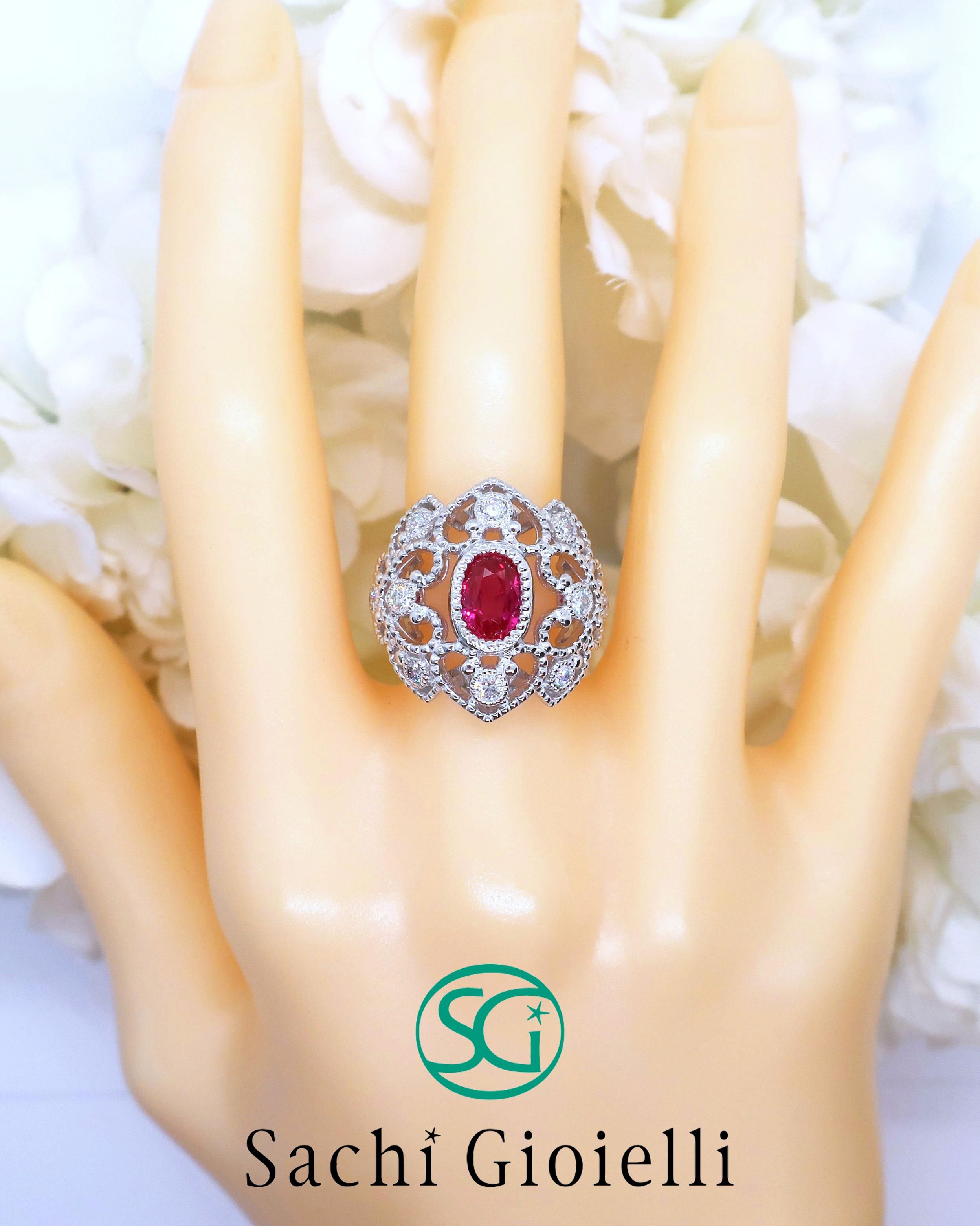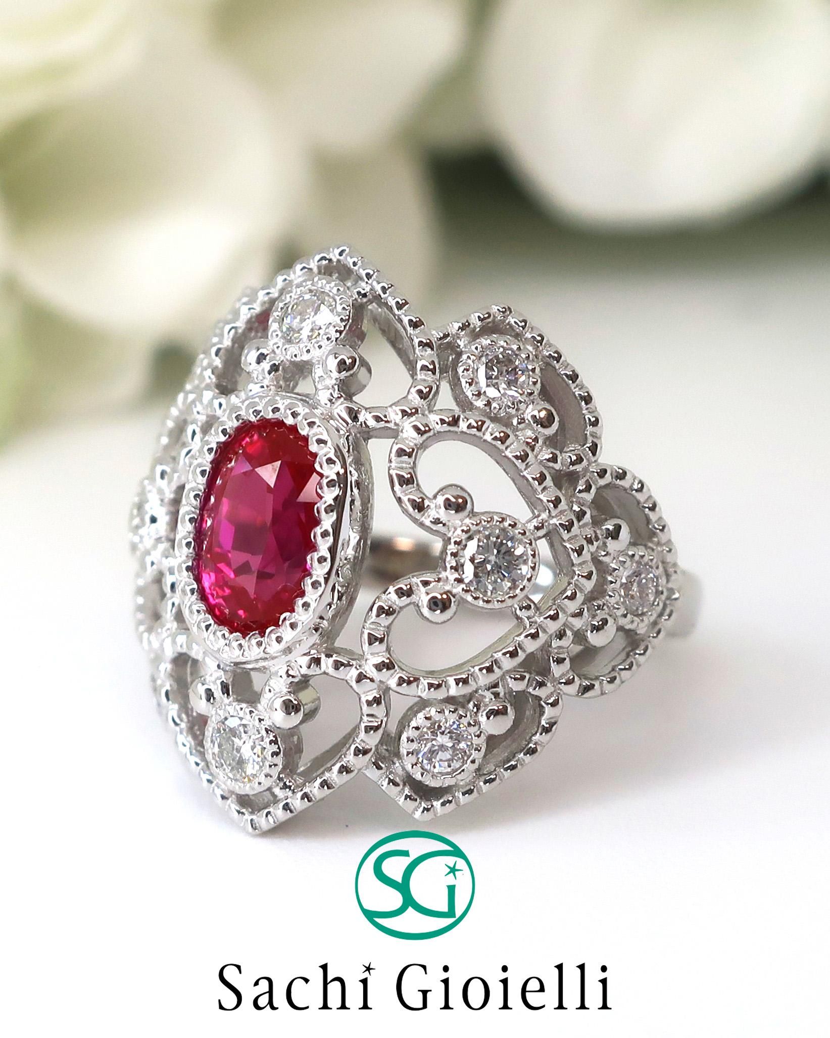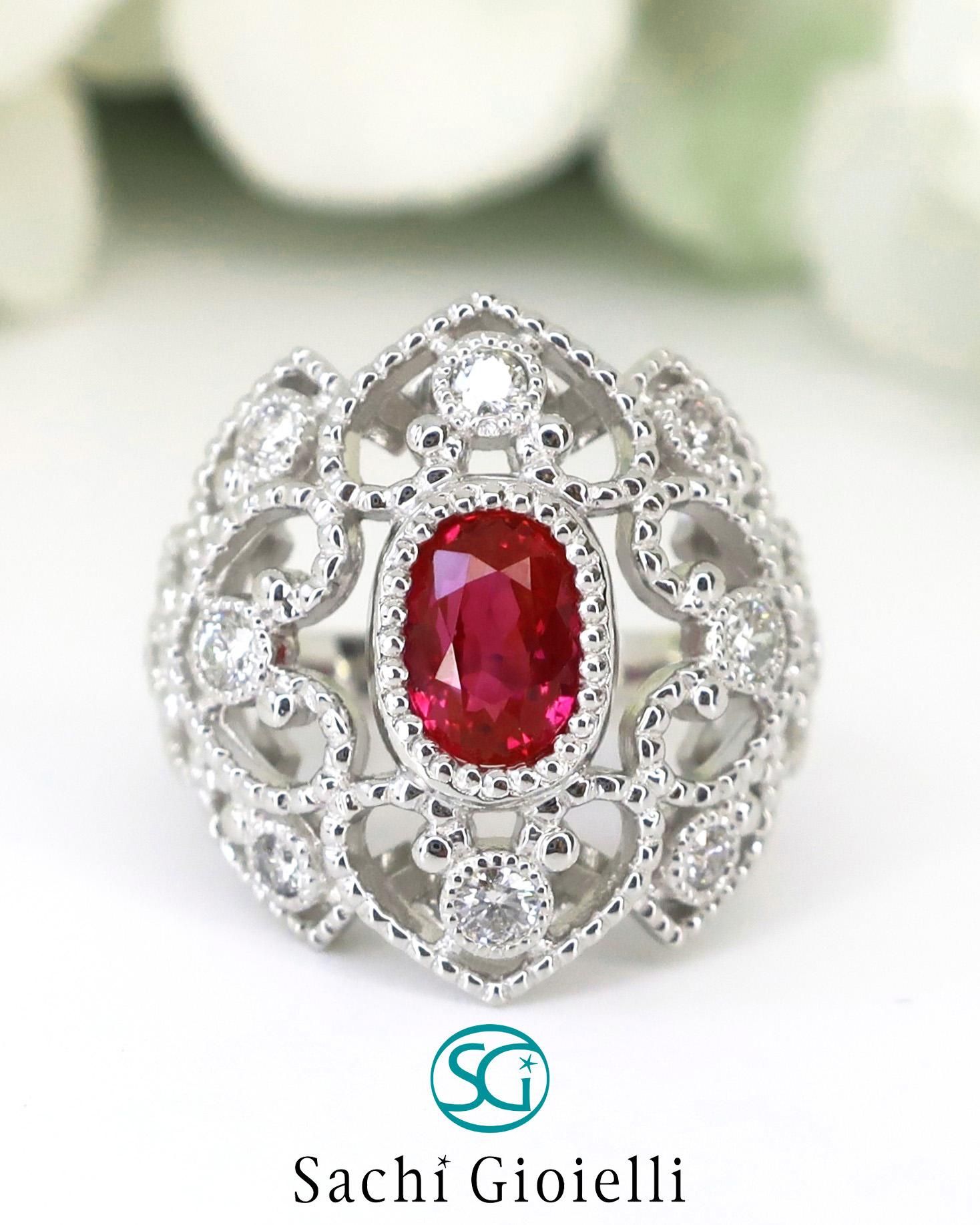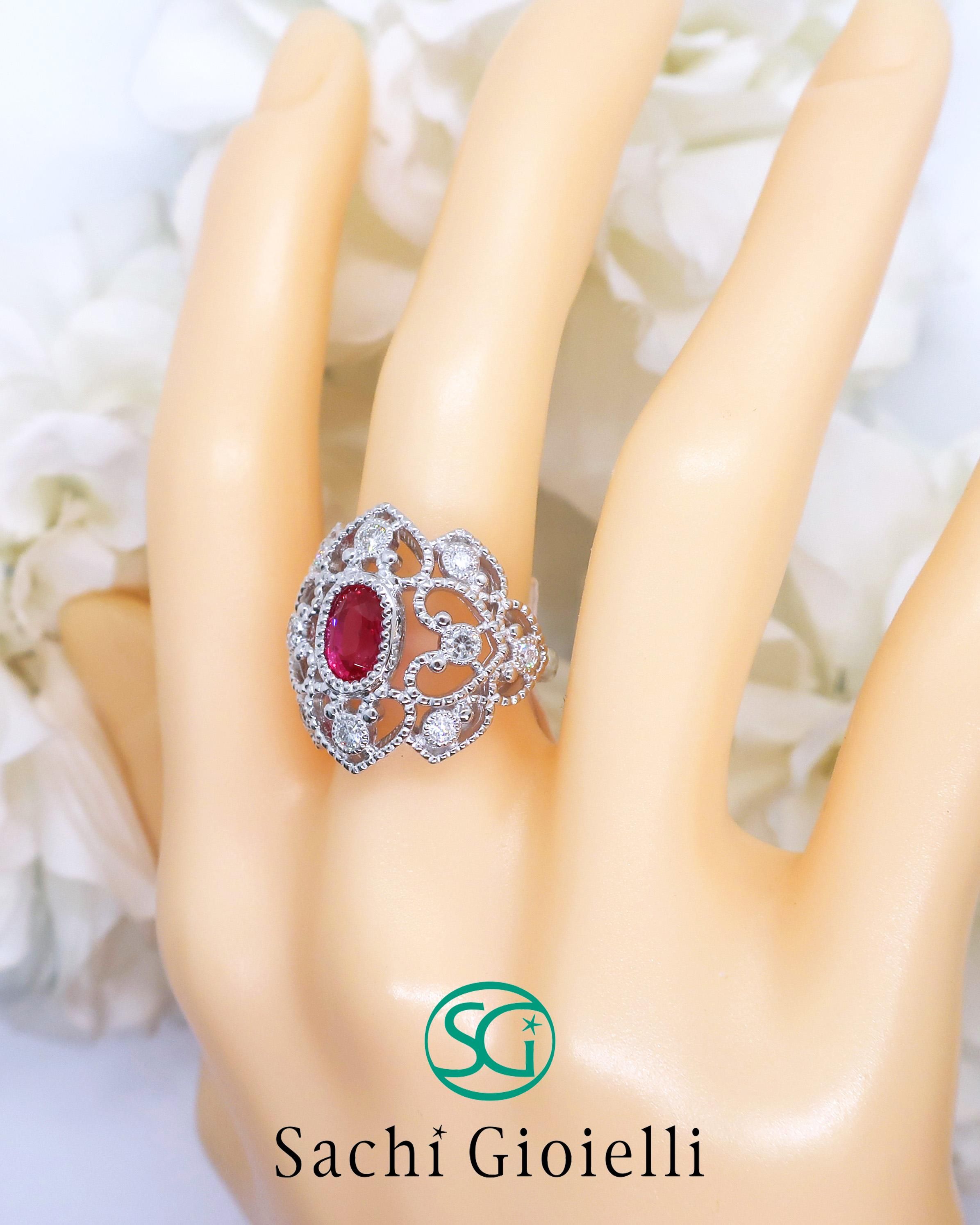 センターの1.525カラットのルビーは内包物もほとんど見られず、素晴らしいテリと輝きに艶やかで深みのあるレッドカラーです。ハートを思わせる立体的な透かし模様には全てに繊細なミル打ち加工が施され、細部にまで拘り抜かれた職人技が感じられます。立体的な透かし細工とダイヤモンドの煌めきが、センターのルビーの輝きをいっそう引き立て、指先に確かな存在感を放ちます。クラシカルでありながら、愛らしさも漂うデザインは特別なシーンにも日常の装いにも映えるリングです。商品には販売証明書を無料でおつけ致します。