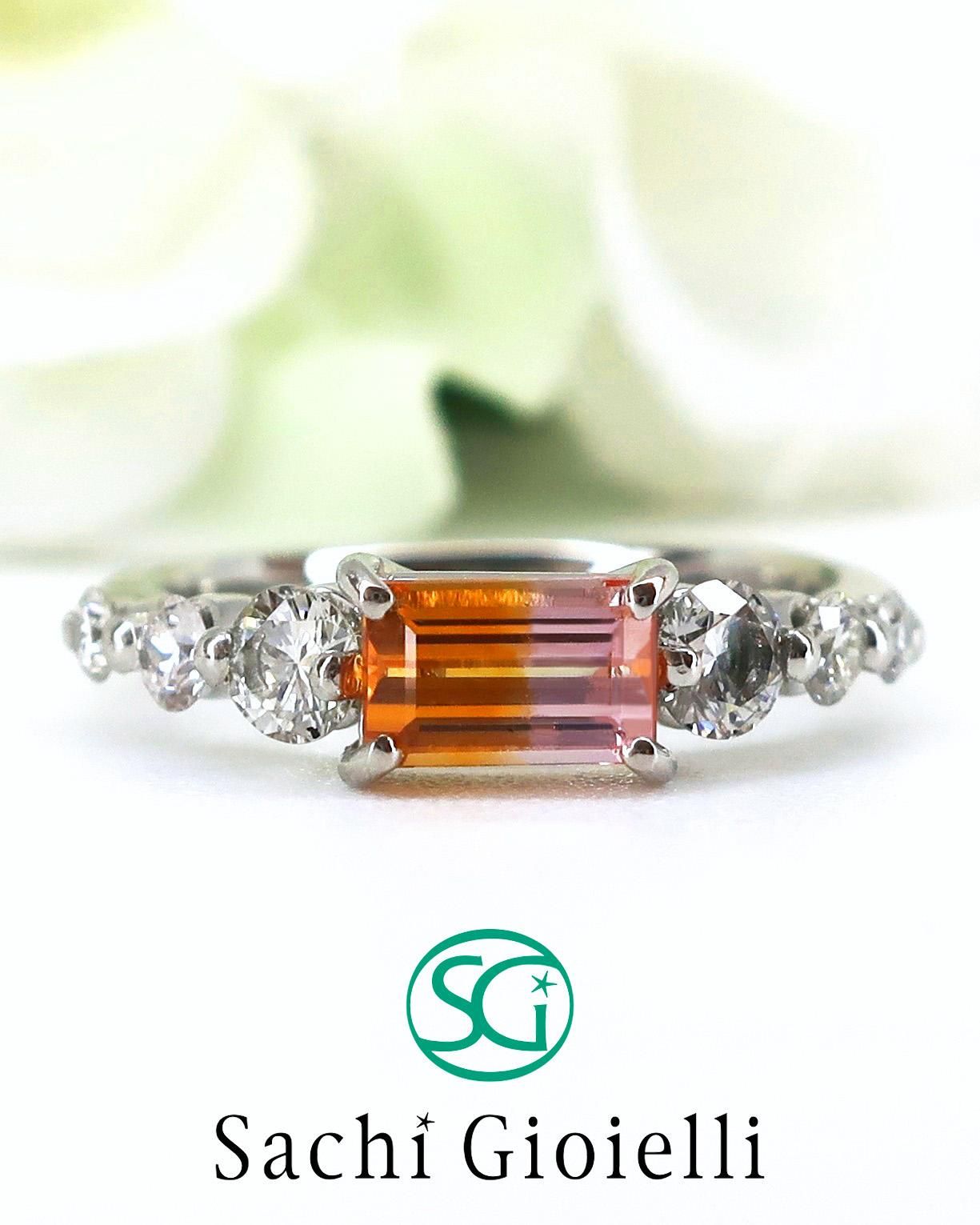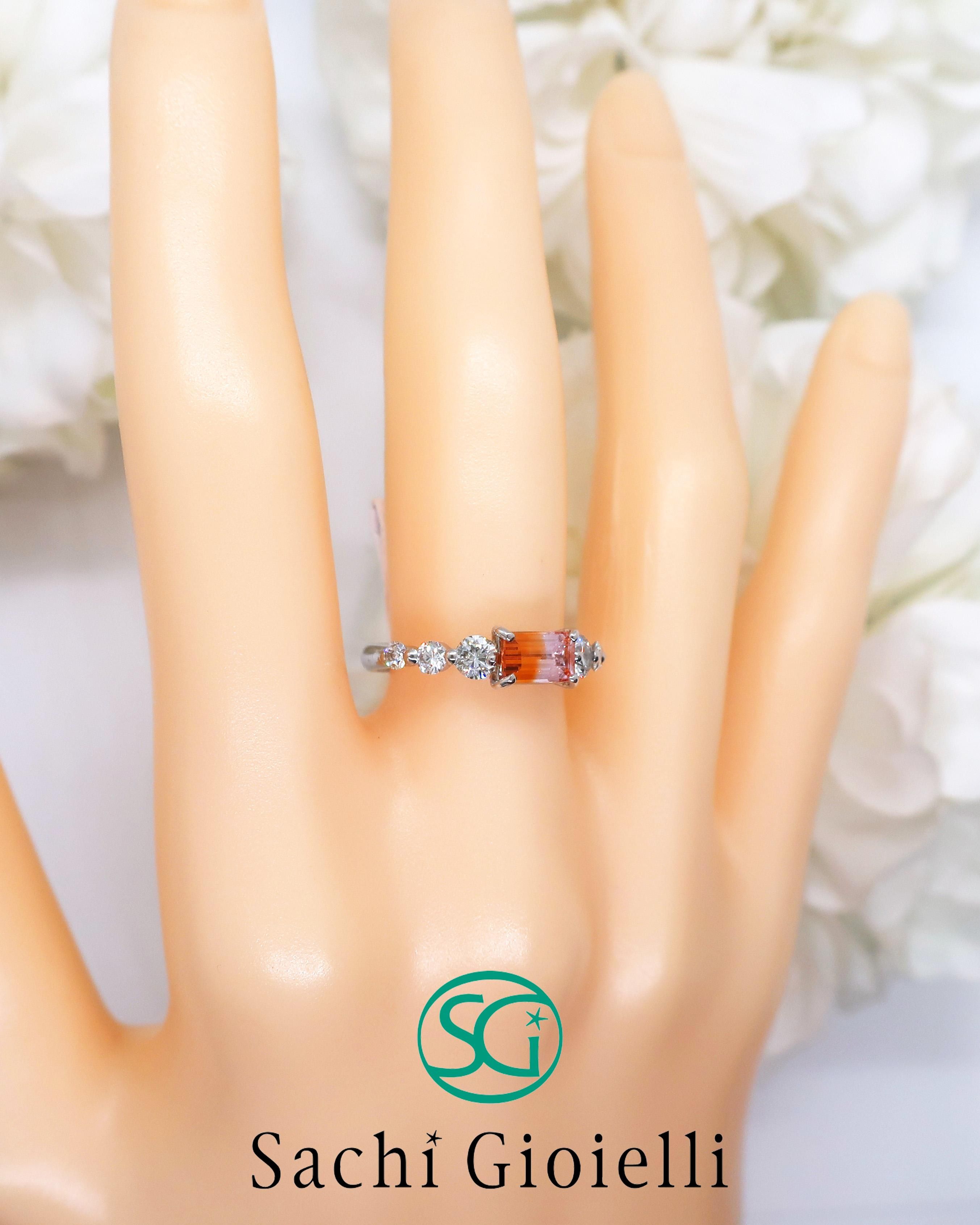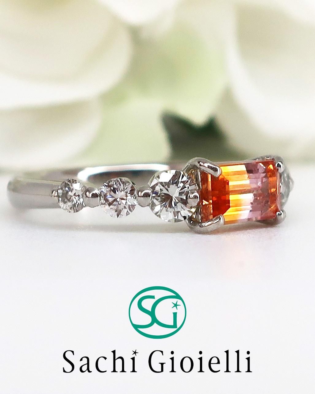ひとつの宝石にオレンジ色とピンク色の2色が共存する、大変珍しい0.87カラットの「バイカラーサファイア」です。バイカラートルマリンはよく目にしますが、サファイアではなかなか見かけません。オレンジに無色、ブルーに無色など、色が抜けただけのタイプはありますが、このようにオレンジとピンクの可愛らしい組み合わせは非常に希少です。サイドに3石ずつダイヤモンドをグラデーションに留めた、シンプルで洗練されたデザインに仕上げられています。メインリングとしても、サブリングとしてもとてもお洒落で、見ているだけで心がときめく、まさに「奇跡の宝石」のバイカラーサファイアリングです。商品には販売証明書を無料でおつけ致します。