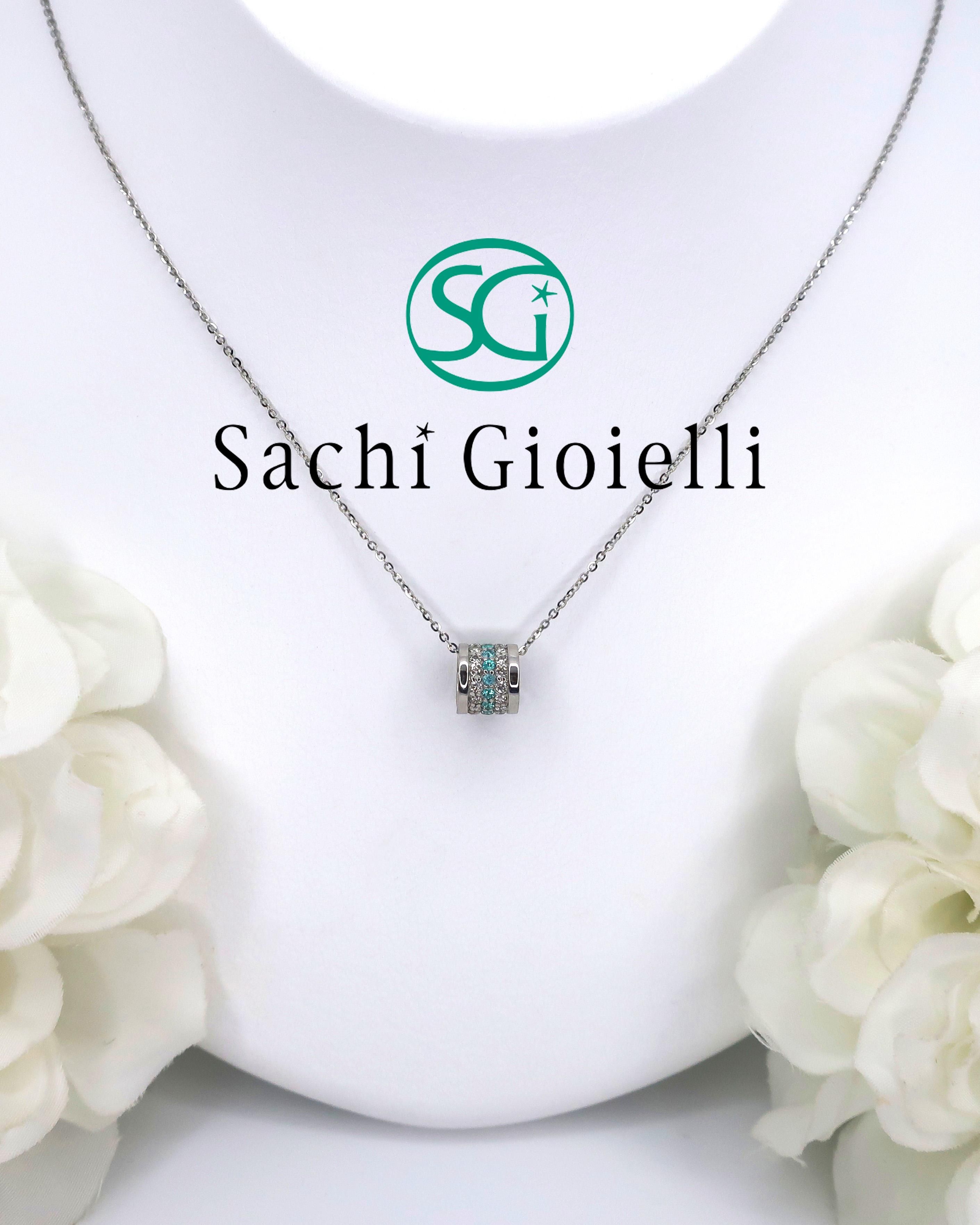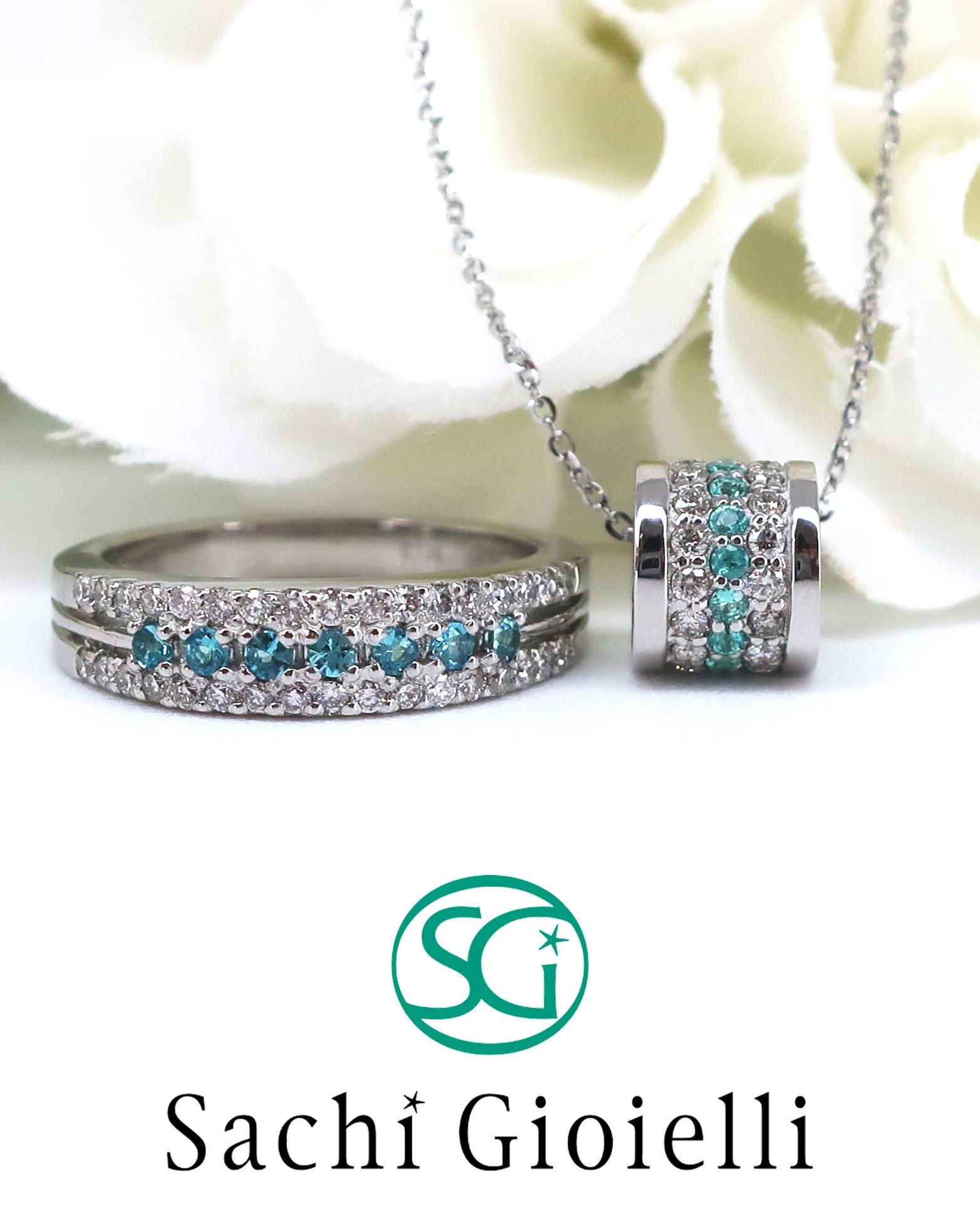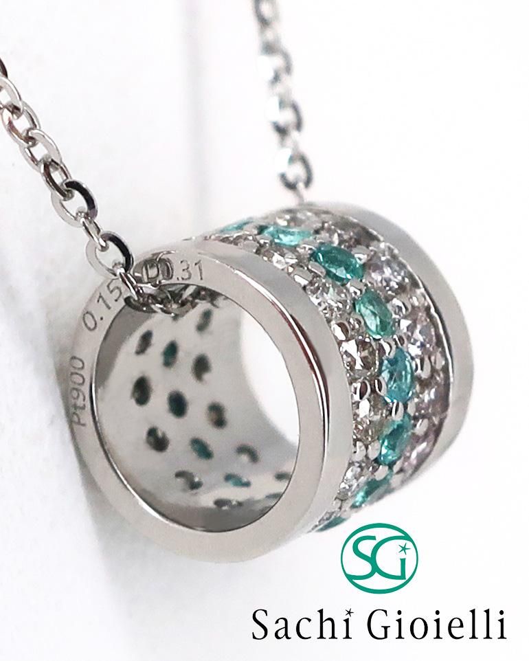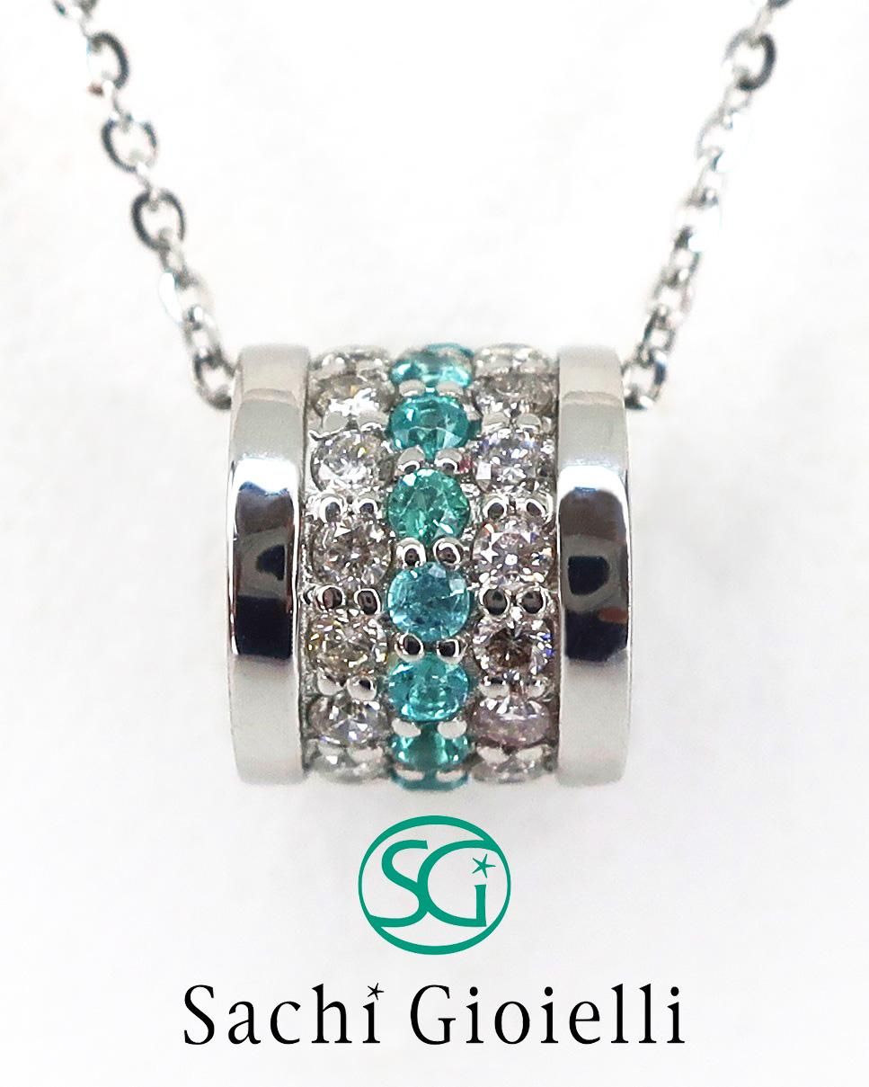 筒状のプラチナの地金に、0.15カラットのブラジル産パライバトルマリンと0.29カラットのダイヤモンドの繊細なラインが施されたペンダントネックレスです。直接、ペンダントトップにチェーンを通すモダンなデザインで動きに合わせてコロコロと回転しても常にパライバトルマリンとダイヤモンドの煌きを楽しんでいただけます。リングとお揃いでお着けいただくと、統一感のある洗練された上品なコーディネイトでデイリーにもぴったりのジュエリーです。商品には販売証明書を無料でおつけ致します。