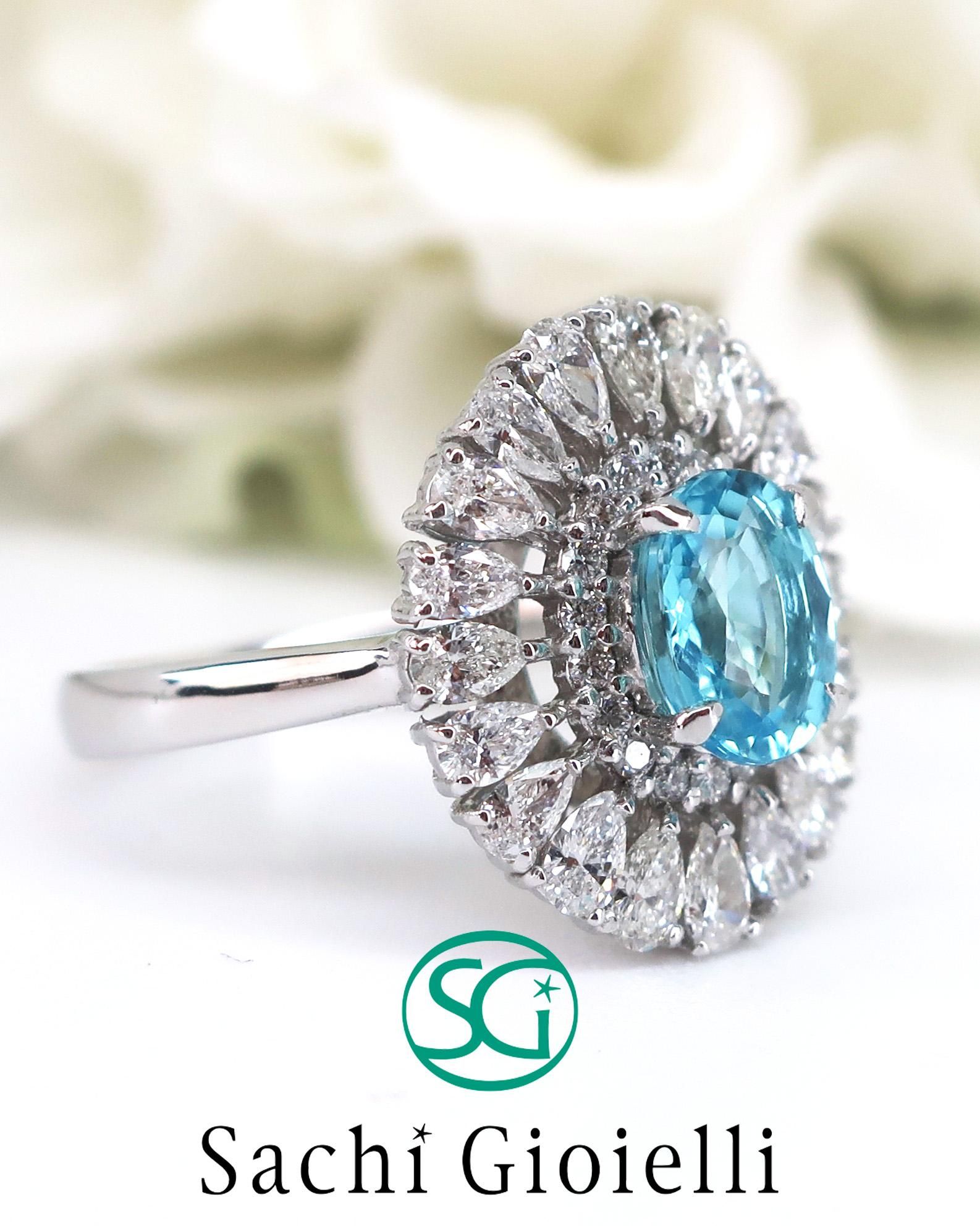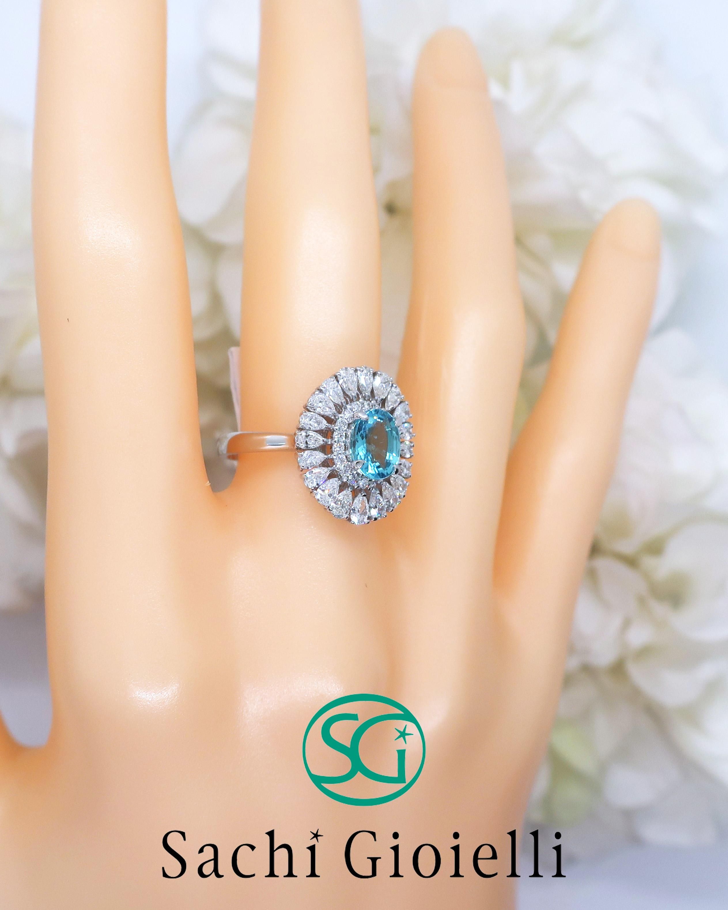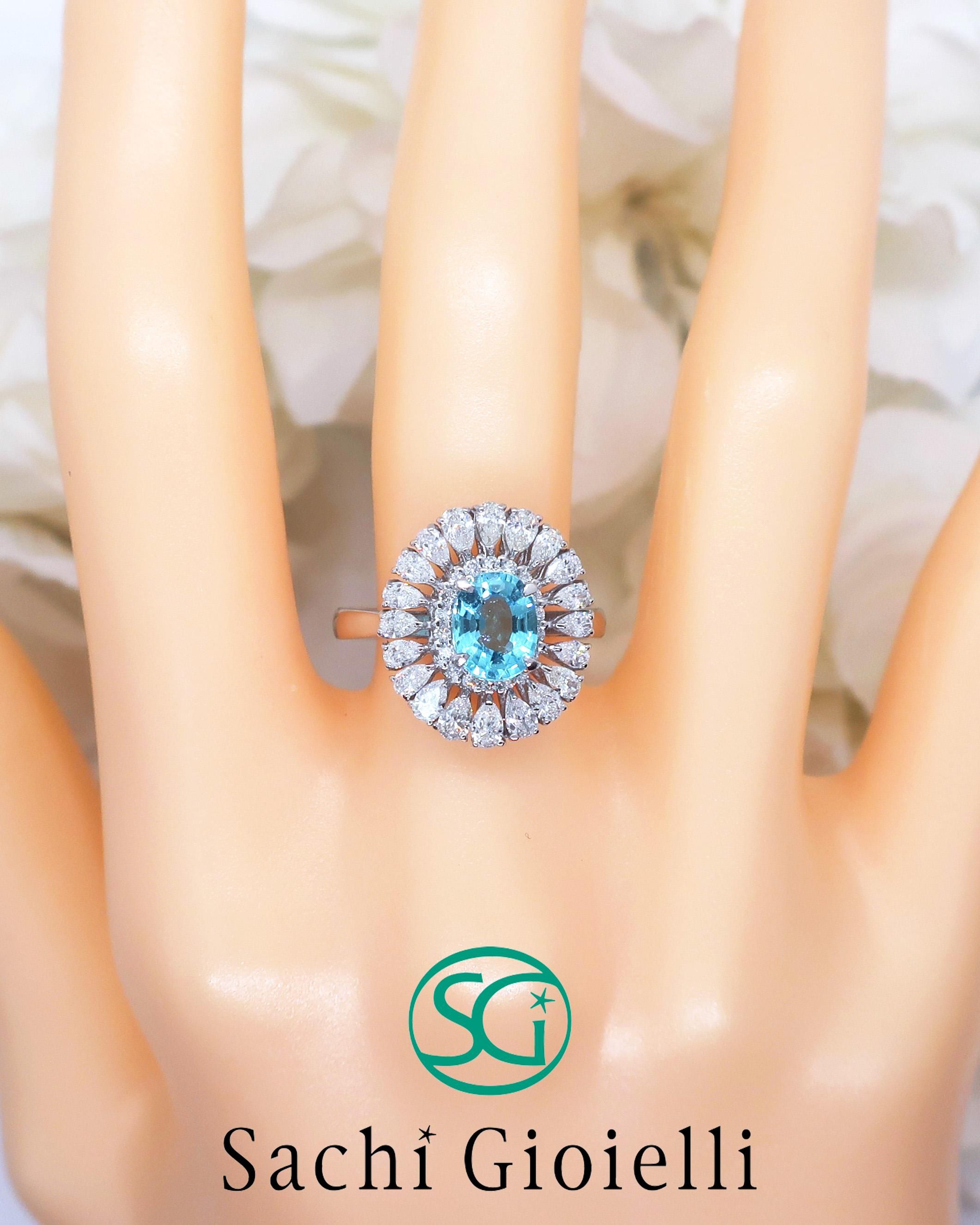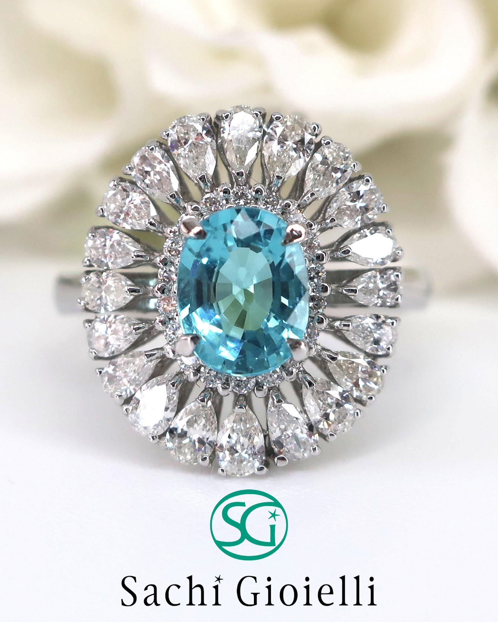 センターの0.96カラットのオーバルカットのパライバトルマリンは、瑞々しい爽やかなネオンブルーの煌めきを放ちます。この美しいパライバトルマリンをダイヤモンドで取り巻き、さらにペアシェイプカットのダイヤモンドで取り巻いたラグジュアリーなリングです。【GIA鑑別書付】