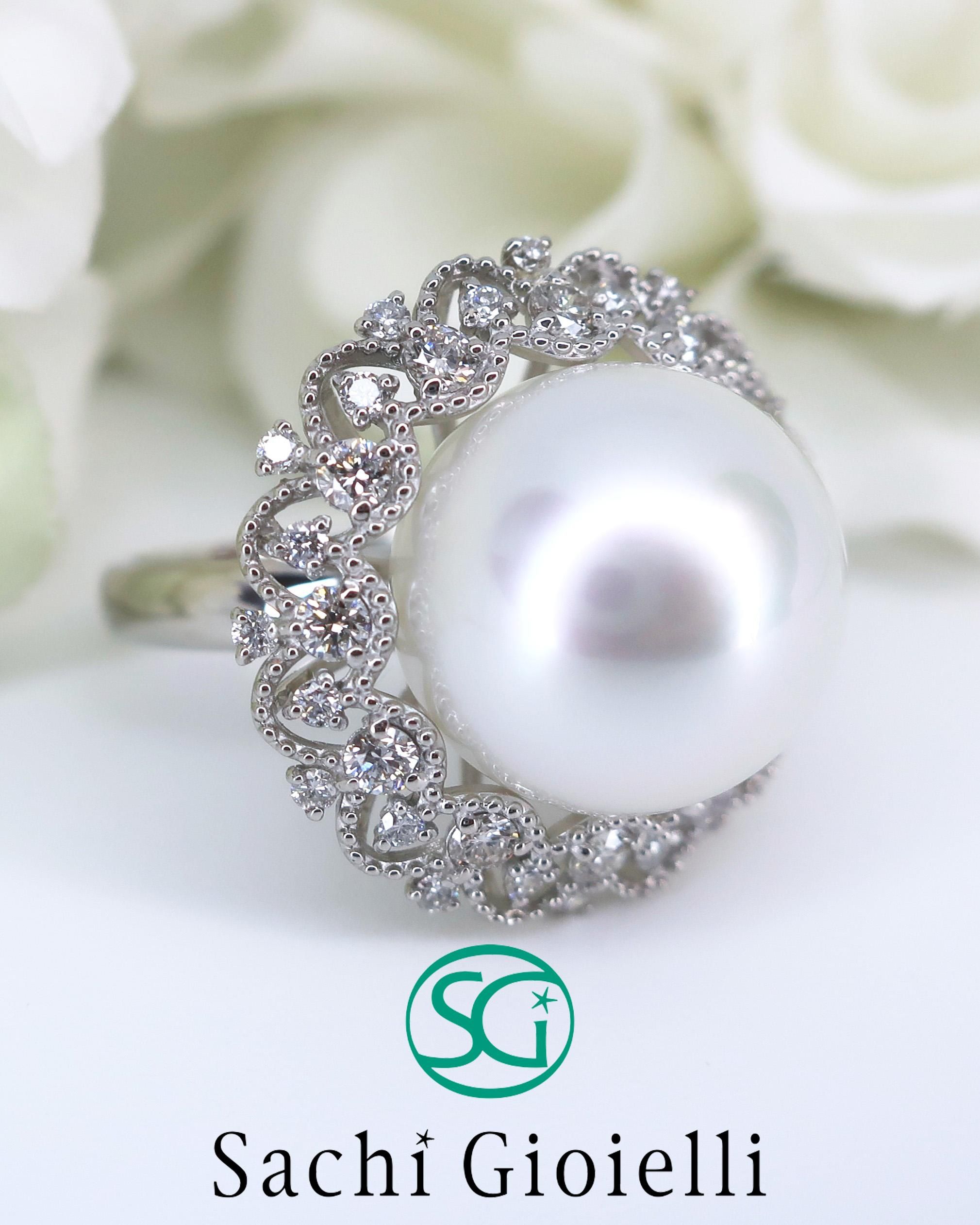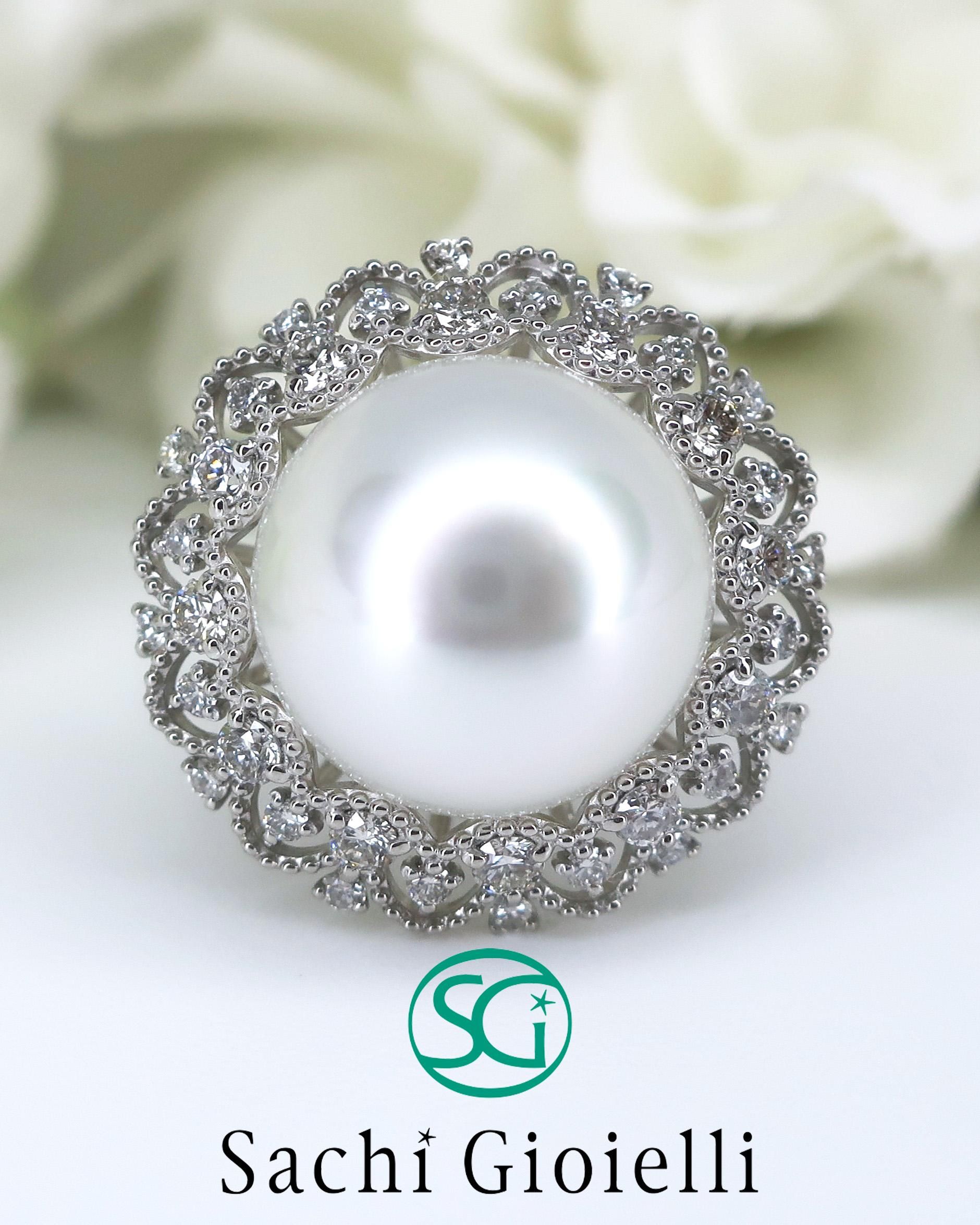 13ミリの南洋パールはヴィーナスの称号をもち、素晴らしいテリと巻きを兼ね備えています。この優美な南洋パールをレースのダイヤモンドのドレスを纏ったようなラグジュアリーリングに仕上げられています。フォーマルにはもちろん、お出かけなどの装いにも大人の品格漂うスタイルを演出してくれます。商品には販売証明書を無料でおつけ致します。