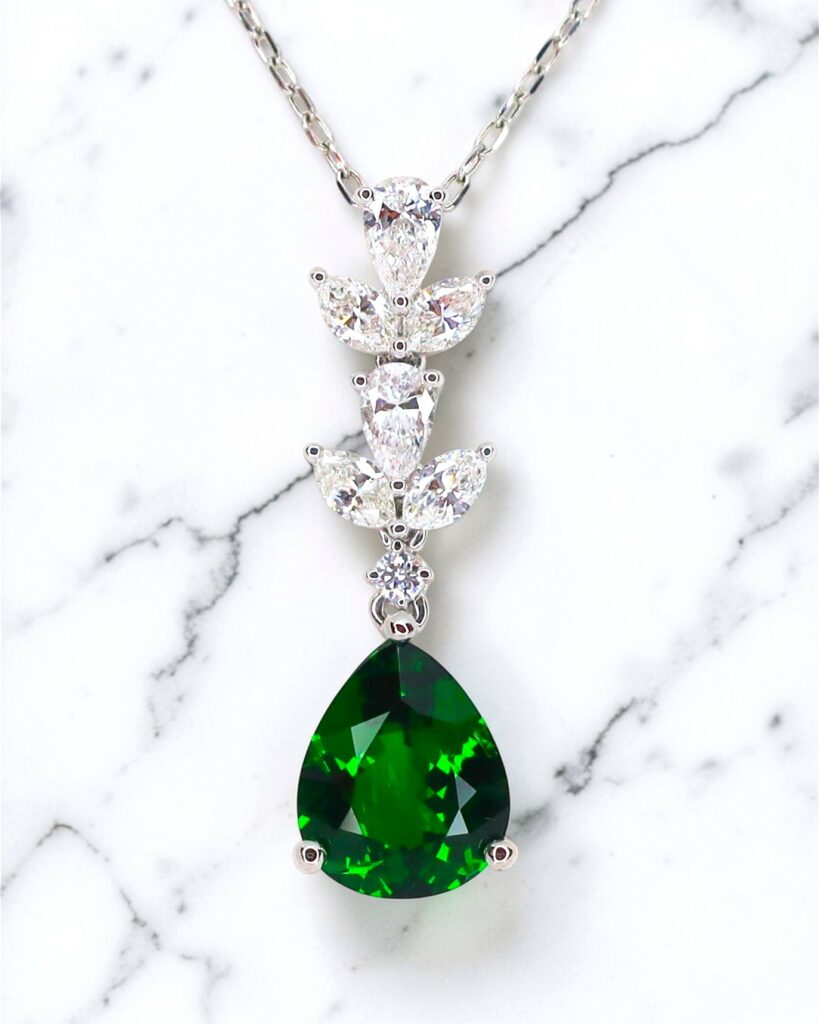 今回のペンダントに使用されているツァボライトは、深みのあるグリーンでありながら、光を受けると鮮やかに輝く上質な一石。