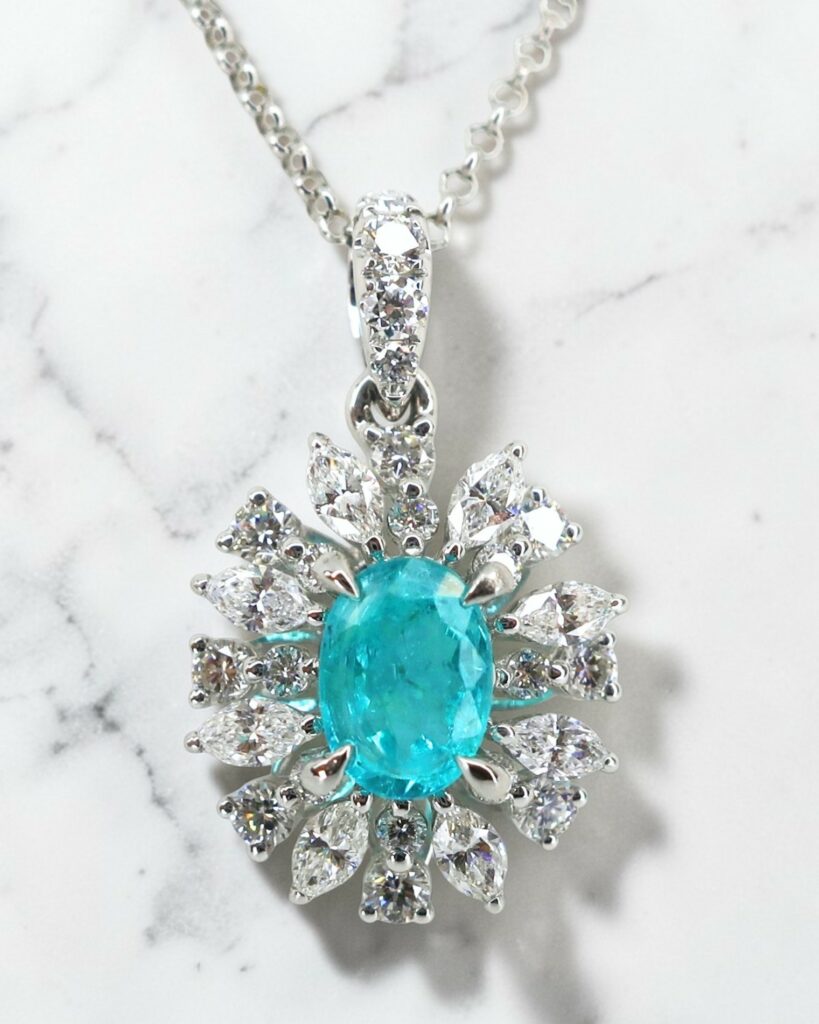 周囲をマーキスとラウンドブリリアントのダイヤモンドを贅沢にあしらい、パライバトルマリンの美しさを一層引き立てる、華やかで上品なデザインです。